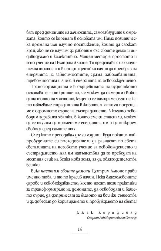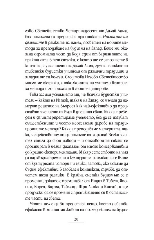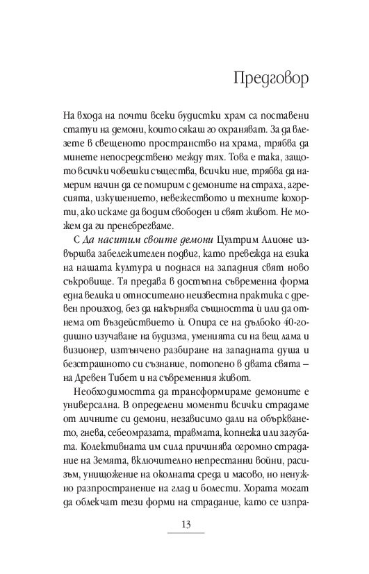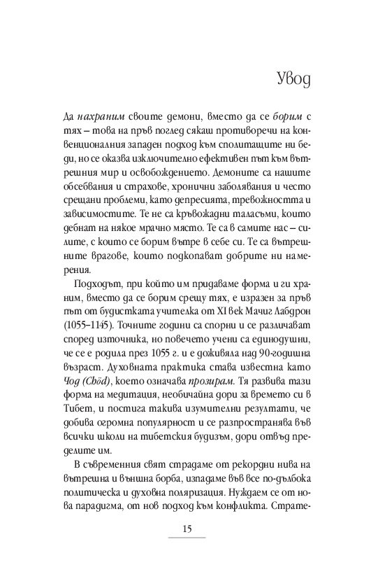 Да наситим своите демони е вдъхновена от древната тибетска практика Чод, разработена от Мачиг Лабдрон – първата жена учител по будизъм от XI век. Дългогодишен практикуващ и учител в областта на духовното знание, лама Цултрим Алионе (автор на Жените на мъдростта) заимства и доразвива идеята за работа с демоните, принасяйки я в дар на съвременния човек. Тя хвърля мост към днешната западна психика и предлага достъпен и ефективен подход за справяне с отрицателните емоции, страховете, болестите и самоунищожителните модели, като извежда радикалната представа, че за да се изцелим, трябва да храним, а не да се борим с демоните си.