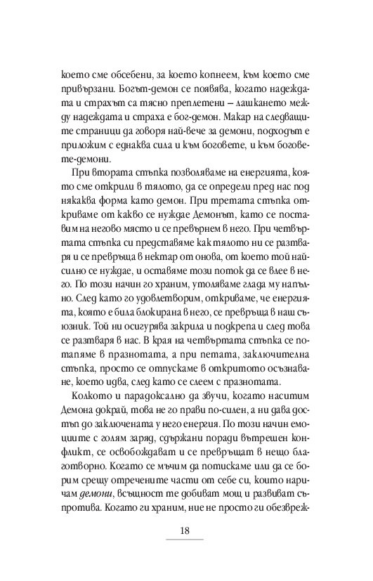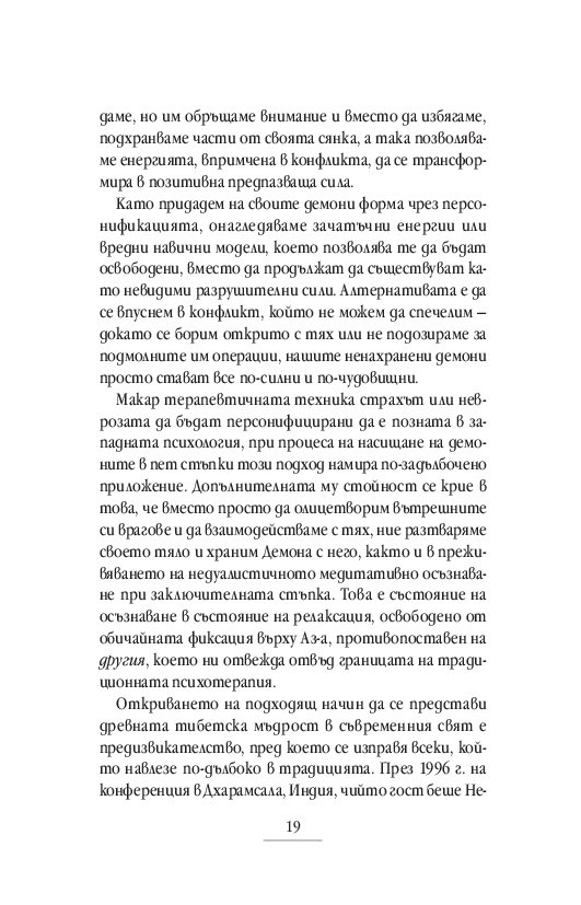Техниката е проста: визуализирайки ги в конкретна форма и предлагайки им това, от което имат нужда, се освобождаваме от тях. На практика се сприятеляваме с това, което най-много ни плаши. Стратегията е любов, грижа и разбиране, а не бягство или борба с враговете. Петте стъпки на практиката ни превеждат през целия процес на трансформиране на Звяра в Съюзник, а енергията, въвлечена във вътрешния конфликт, се освобождава и се превръща в неоценим ресурс и потенциал за лично израстване.