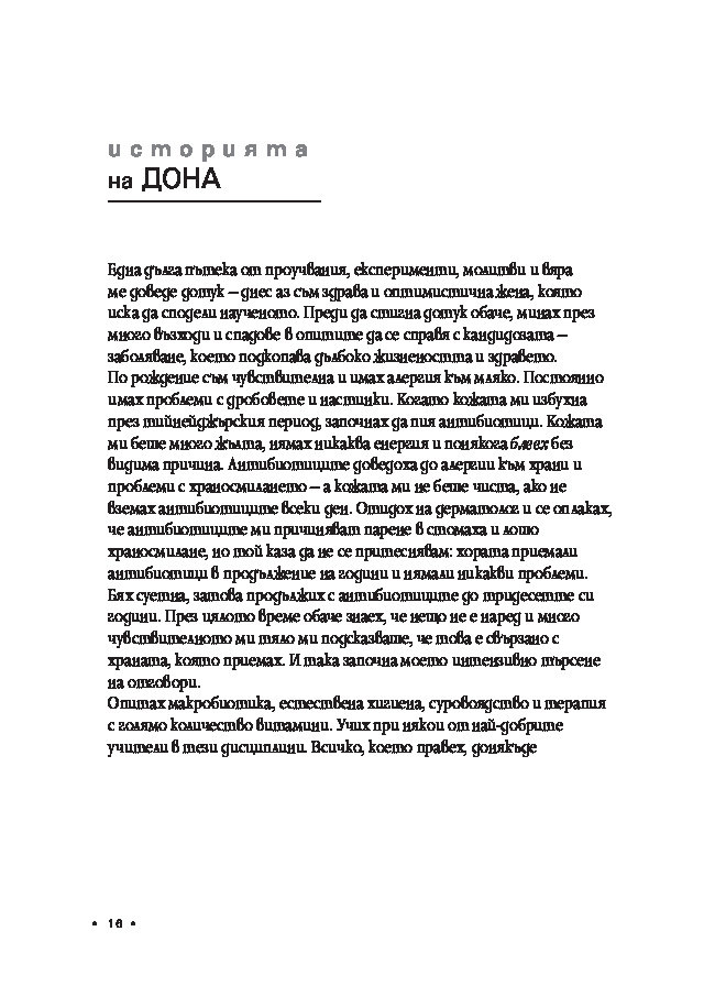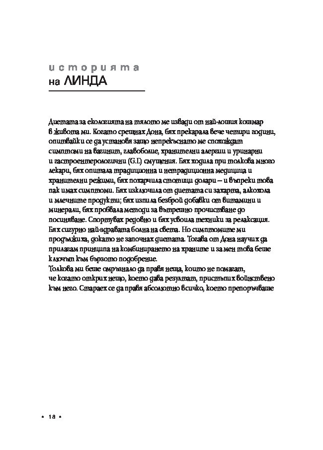 Диетата за екологията на тялото ни показва как да възстановим и поддържаме вътрешната екология, от която се нуждае тялото, за да функционира правилно, и да елиминираме или контролираме симптомите, които ни отнемат радостта от живота. Дона Гейтс ви показва стъпка по стъпка как да се храните така, че да сте по-здрави и силни – вкусно, лесно и евтино!