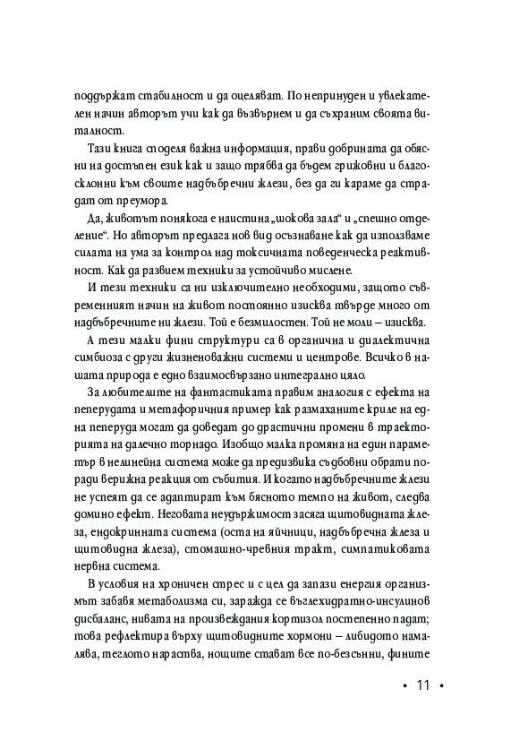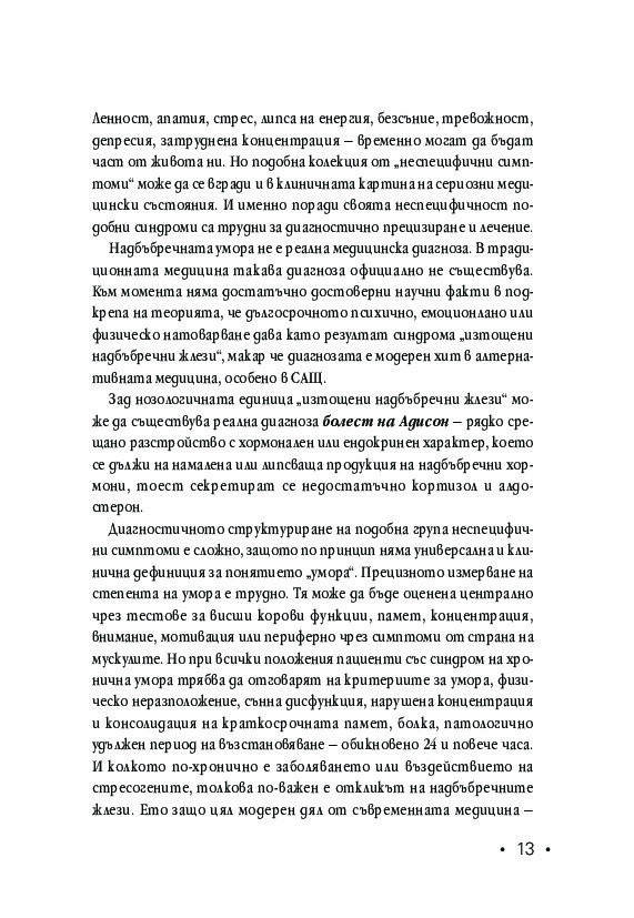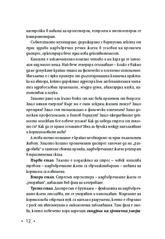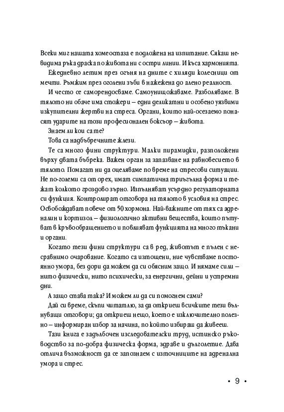 Авторът запознава читателите с подходящ хранителен режим, хранителни добавки и надбъбречни екстракти. Те ще могат да възстановят нарушенията във функциите на адреналната жлеза и да се спасят от надбъбречната умора, за да си възвърнат енергията, защитните сили на организма, жизнеността и радостта от живота.