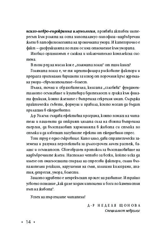 Книгата „Надбъбречна умора“ е предназначена за широката аудитория и дава насоки на хора без медицинско образование, които подозират, че страдат от синдрома на надбъбречна умора, как да установят сами дали действително са с дадена степен на изчерпване на адреналните жлези.