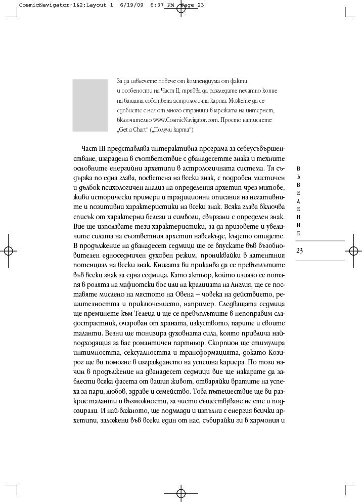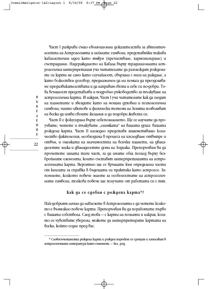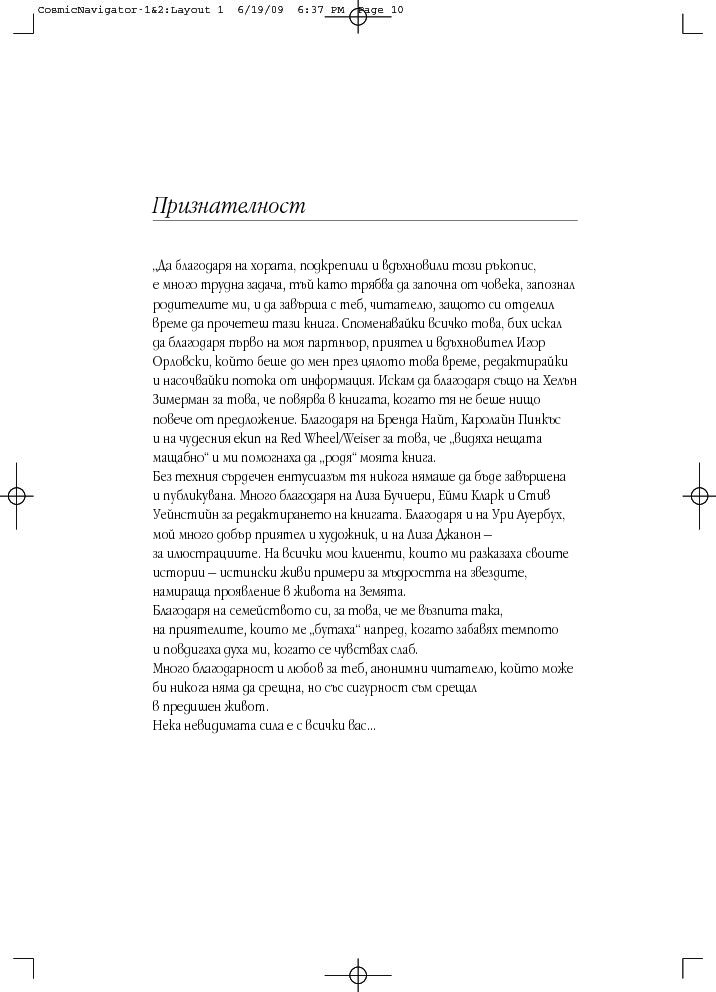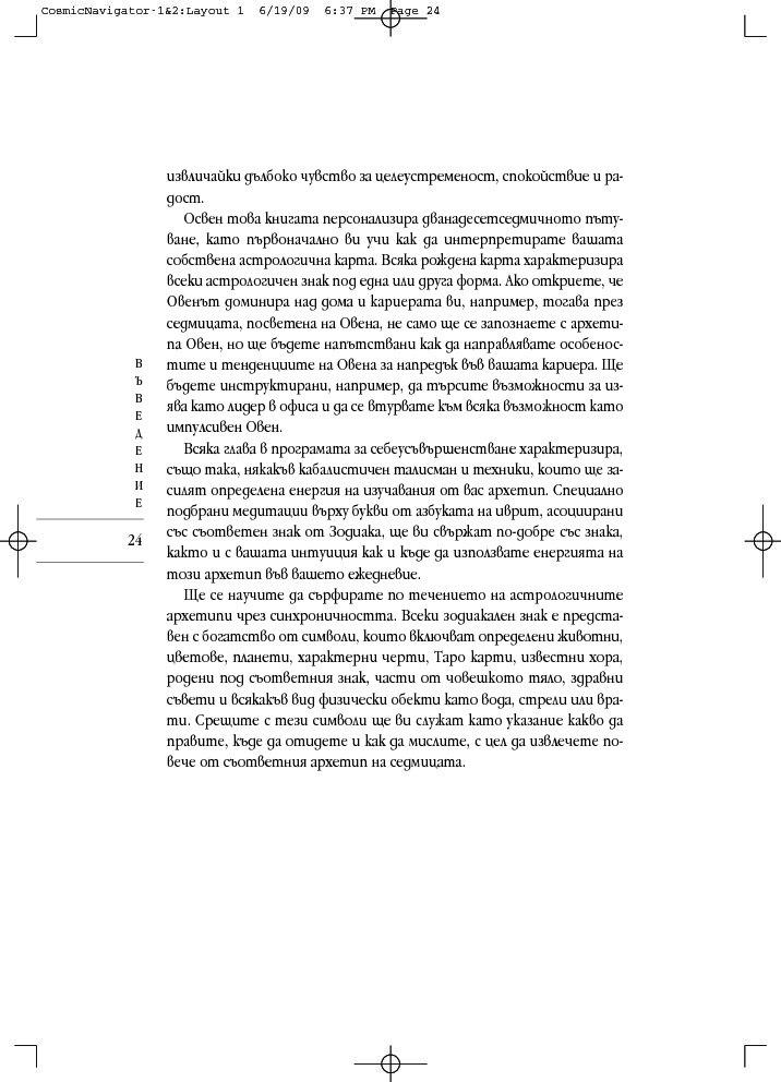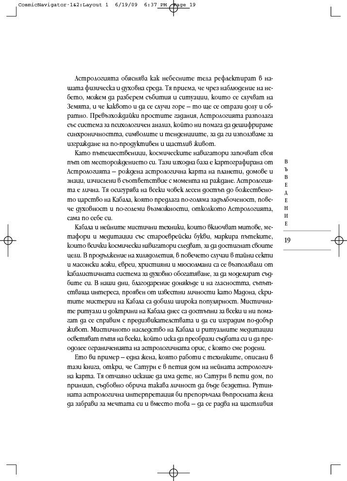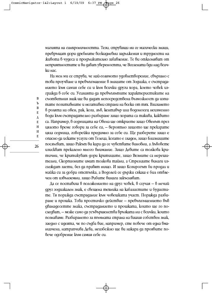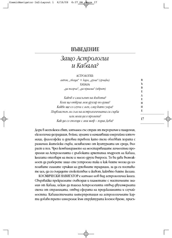 „Космически навигатор“ се различава от останалите астрологични книги. Тя свързва представите за прекрасните съзвездия и планетите с мистичните кабалистични знания и извежда астрологичните тълкувания извън двуизмерната схема на листа хартия, надхвърля сферата на предсказанията и случайността. При интерпретацията на астрологичните карти, към традиционната структура космос-време се добавя и трето измерение – духовният компонент, наситен с енергиите на дванадесетте знака на Зодиака.