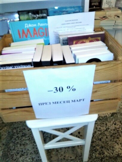 –20% на 6 и 7 март. Само през тези два дни и само в книжарница КИБЕА можете да вземете любимо заглавие с минус 20% от коричната цена. Предложението не включва намалени книги и онлайн поръчки. Книжарницата ни ще работи на 7 март (събота) вместо 9 март (понеделник).
