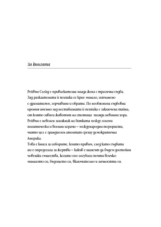 Рейвън Слейд е привлекателна млада жена с трагична съдба. Зад разклатената ѝ психика се крие минало, изпълнено с драматизъм, горчивини и обрати. По необяснима съдбовна ирония именно зад нестабилната ѝ психика е заключена тайна, от която зависи животът на стотици хиляди невинни хора. Рейвън е неволен заложник на битката между големи политически и военни играчи – международни терористи, чиято цел е грандиозен атентат срещу демократична Америка.