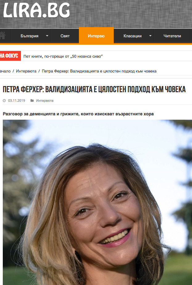 Петра Ферхер е социален работник и специалист по валидизация – един непознат в България метод, който подпомага болните от деменция и техните близки. Той съществува от 60-те години благодарение на американския геронтолог Наоми Файл – проправила пътя на сериозна школа в Европа, конкретно в Австрия, откъдето идва и Петра. Трудно ни е да повярваме, че тази лъчезарна, артистична жена посвещава своето време на възрастни хора с проблеми, но тя говори с такава любов за тях, че всякакъв скетцицизъм по отношение на въпроса „що за теория е това“, изчезна. Още повече, че Петра Ферхер систематизира опита си в книга – „Мостове към света на деменцията. Валидизация за всеки ден“, която пише заедно със своята колега от Дания Гунвор Срамек. Разговора водим с помощта на преводча на книгата – Галя Баева.