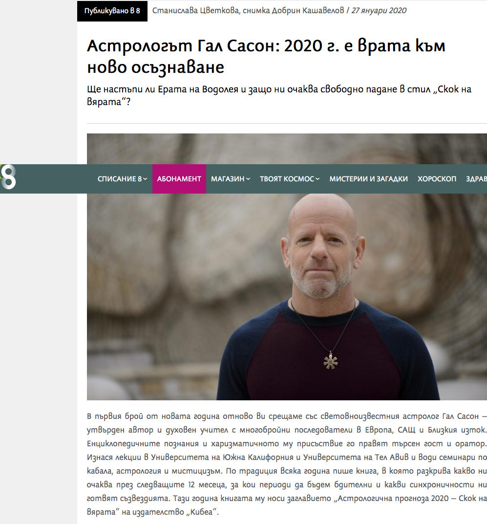 В първия брой от новата година отново ви срещаме със световноизвестния астролог Гал Сасон – утвърден автор и духовен учител с многобройни последователи в Европа, САЩ и Близкия изток. Енциклопедичните познания и харизматичното му присъствие го правят търсен гост и оратор. Изнася лекции в Университета на Южна Калифорния и Университета на Тел Авив и води семинари по кабала, астрология и мистицизъм. По традиция всяка година пише книга, в която разкрива какво ни очаква през следващите 12 месеца, за кои периоди да бъдем бдителни и какви синхроничности ни готвят съзвездията. Тази година книгата му носи заглавието „Астрологична прогноза 2020 – Скок на вярата“ на издателство „Кибеа“.