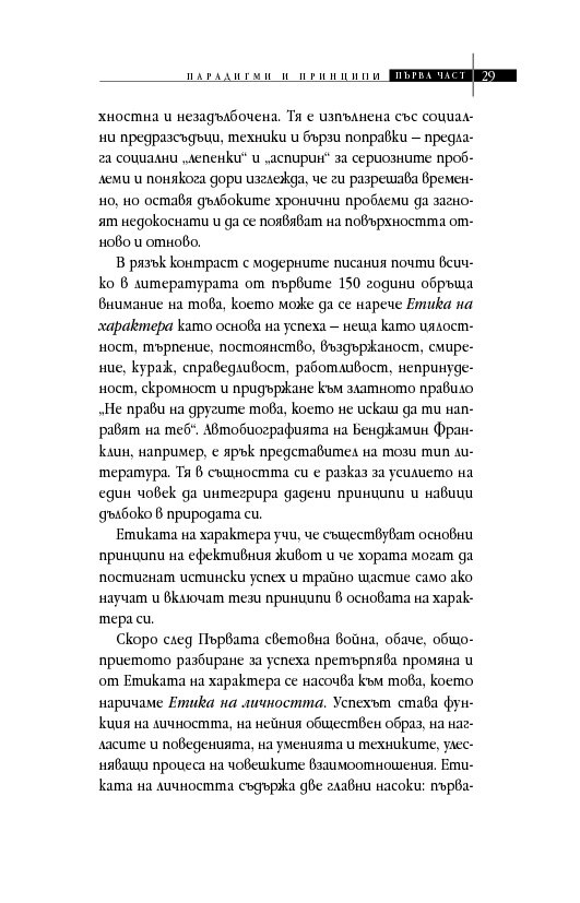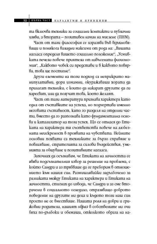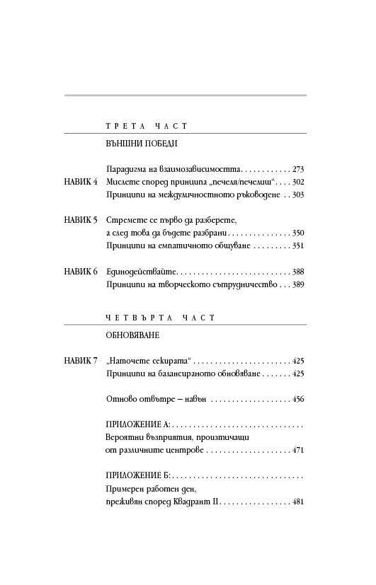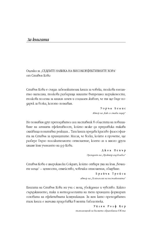 Простичко, ясно и подредени в стройна работеща система са представени седем универсални жизнени постулата, които ще помогнат на мотивирания човек да постигне успех в една или друга област. Седемте принципа на Кови са изведени след проучването на огромен по обема си материал в областта на управлението, лидерството и психологията, в т.ч. организационната, както и на истории от живота на известни личности.