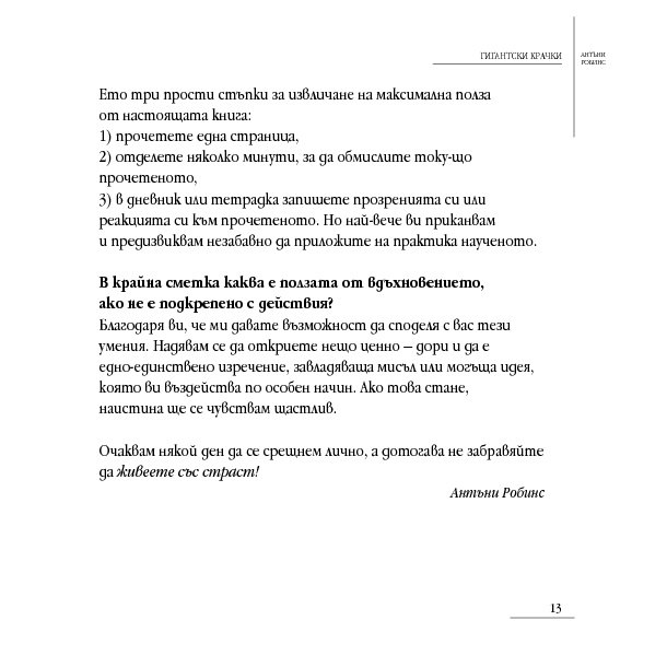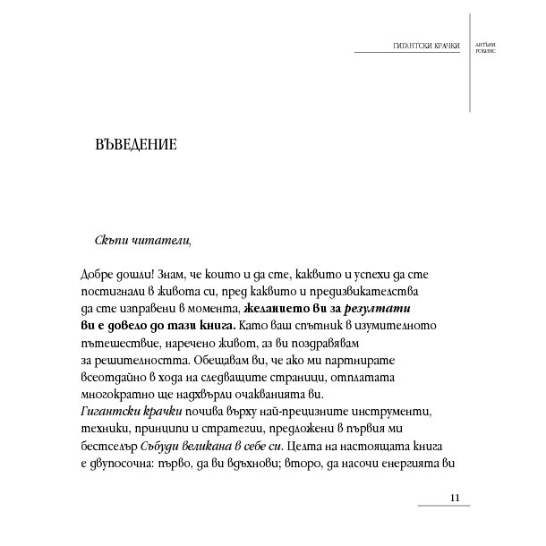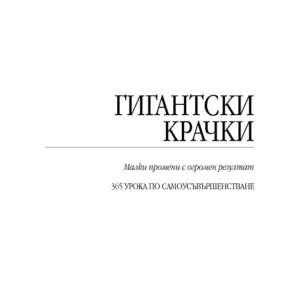 От простата сила на вземането на решения до по-конкретните инструменти, които могат да променят качеството на връзките, финансите, здравето и емоциите ви, в „Гигантски крачки“ Робинс ви показва как да постигнете максимални резултати с минимална инвестиция на време.