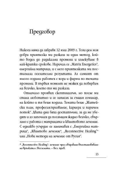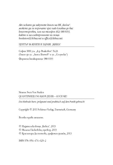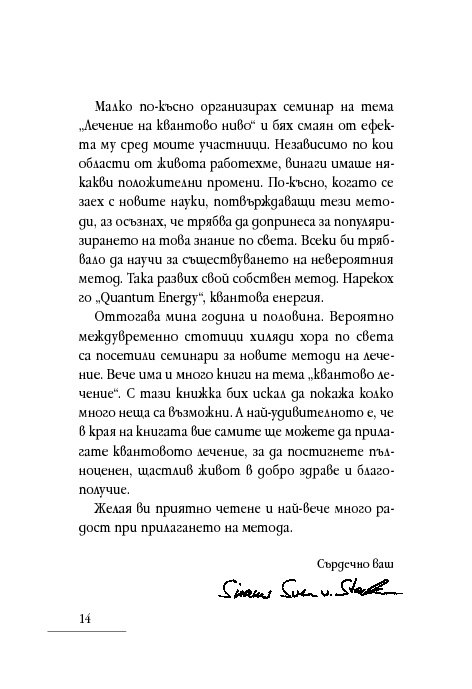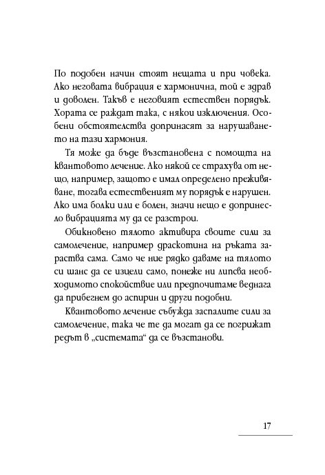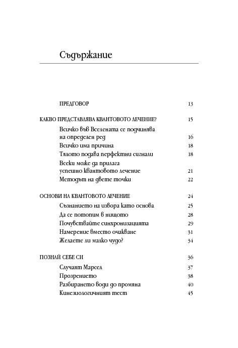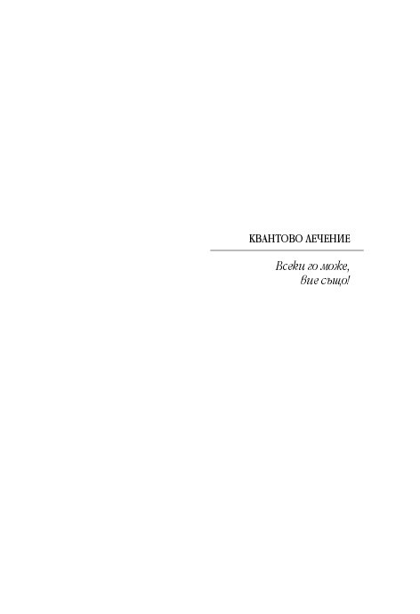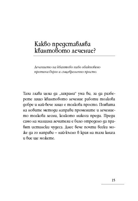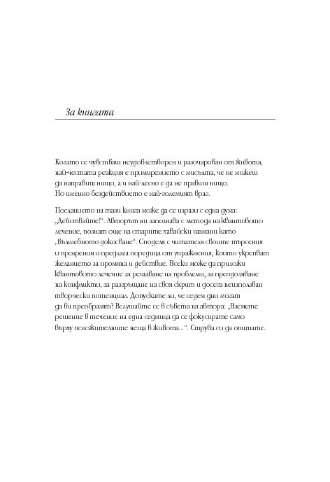 Посланието на тази книга може да се изрази с една дума: „Действайте!“. Методът на квантовото лечение е познат още на старите хавайски шамани. Той е „вълшебно докосване“. Поредица упражнения укрепват желанието за промяна и действие. Всеки може да приложи квантовото лечение за решаване на проблеми, за преодоляване на конфликти, за разгръщане на своя скрит и досега неизползван творчески потенциал. Допускате ли, че седем дни могат да ви преобразят? Вслушайте се в съвета на автора: „Вземете решение в течение на една седмица да се фокусирате само върху положителните неща в живота...“. Струва си да опитате.