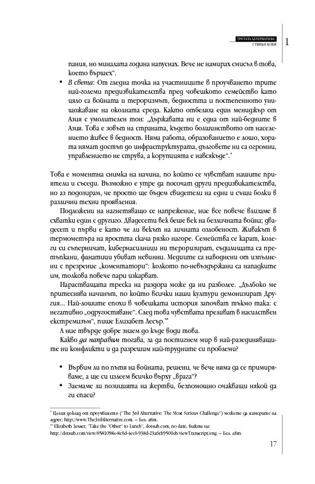 В този свой олимпийски скок Кови е написал по моему най-амбициозната си и изпълнена с надежда книга – шедьовър, който ще помогне на всички ни да дадем най-доброто от себе си, за да живеем в мир и справедливост в днешния объркан свят.“