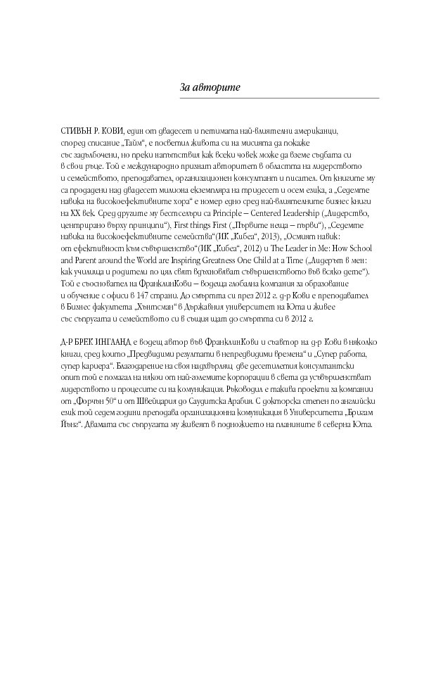 „Можете да схванете посланието на Стивън Кови в рамките на пет страници и дори по-малко. Аз обаче искрено се надявам внимателно да прочетете и да използвате всяка една страница. Стивън ни е дал ценен дар, но както при повечето проницателни идеи само ежедневната съзнателна практика може и ще промени живота ни.“