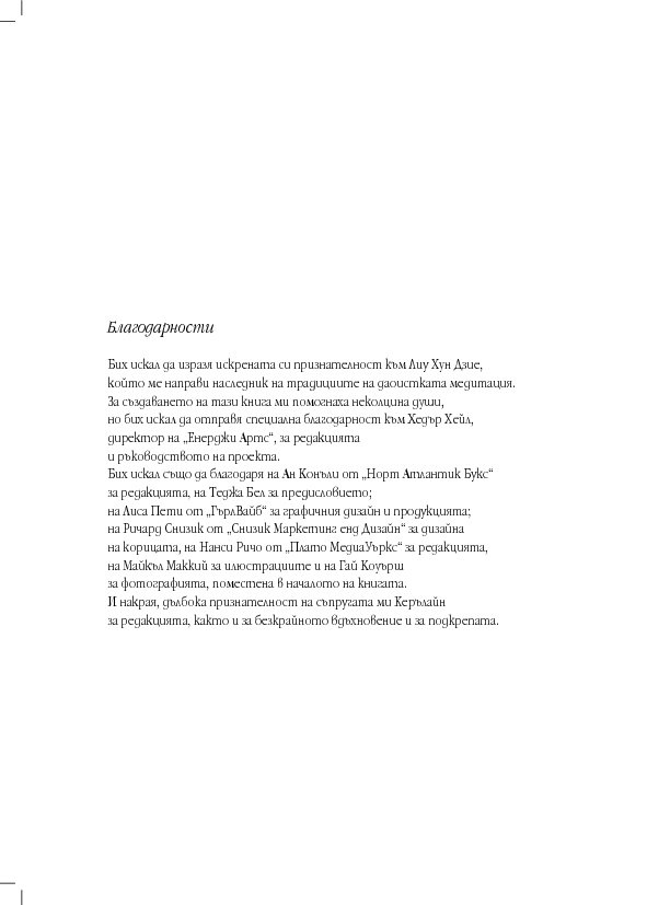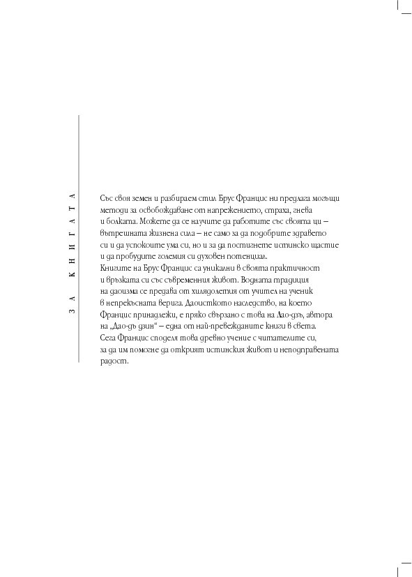 Със своя земен и разбираем стил Брус Францис ни предлага могъщи методи за освобождаване от напрежението, страха, гнева и болката. Можете да се научите да работите със своята ци – вътрешната жизнена сила – не само за да подобрите здравето си и да успокоите ума си, но и за да постигнете истинско щастие и да пробудите големия си духовен потенциал.
