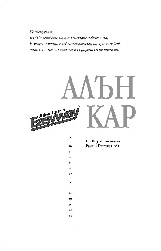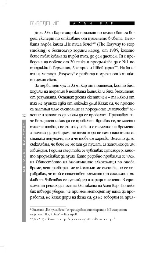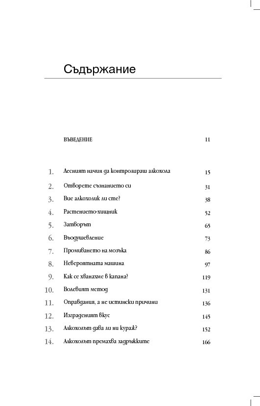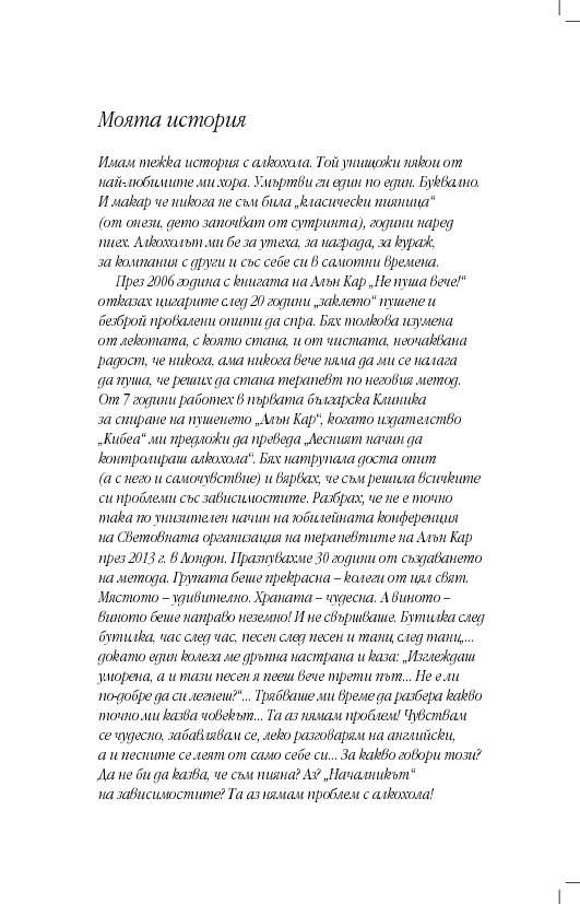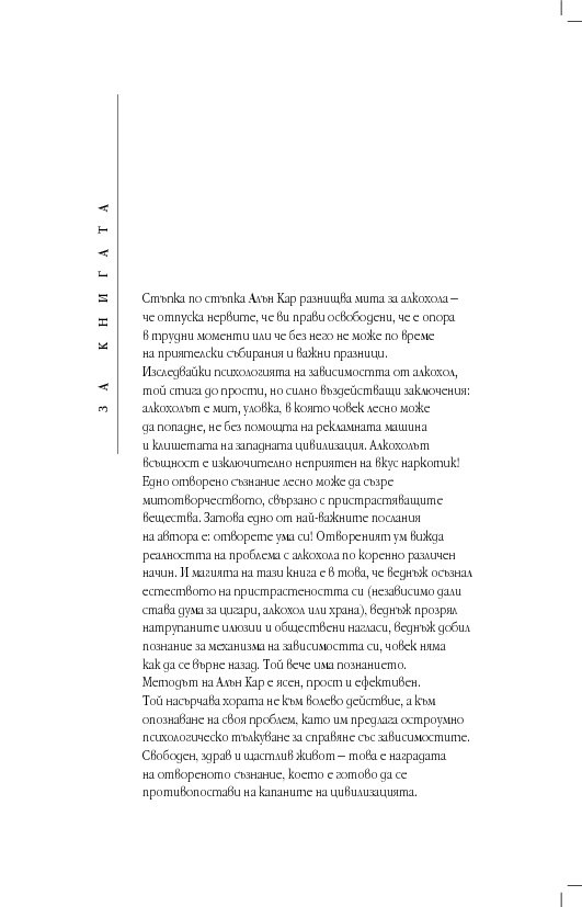 Едно отворено съзнание лесно може да съзре митотворчеството, свързано с пристрастяващите вещества. Затова едно от най-важните послания на автора е: отворете ума си! Отвореният ум вижда реалността на проблема с алкохола по коренно различен начин. И магията на тази книга е в това, че веднъж осъзнал естеството на пристратеността си (независимо дали става дума за цигари, алкохол или храна), веднъж прозрял натрупаните илюзии и обществени нагласи, веднъж добил познание за механизма на зависимостта си, човек няма как да се върне назад. Той вече има познанието. Методът на Алън Кар е ясен, прост и ефективен.