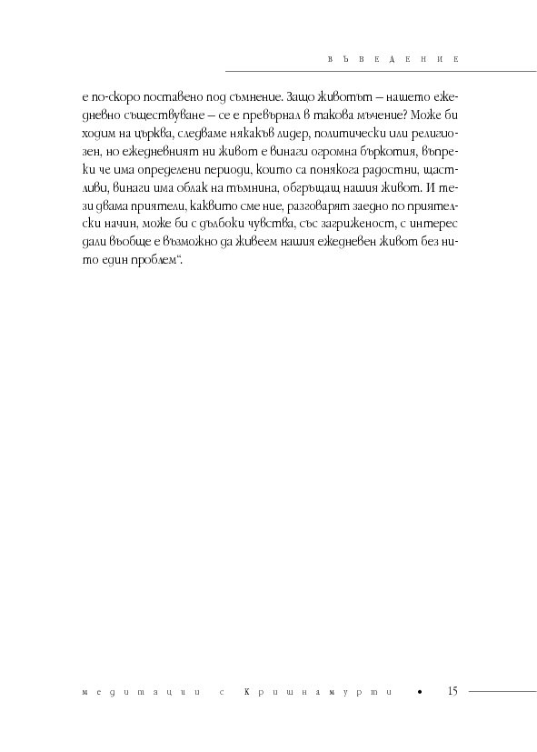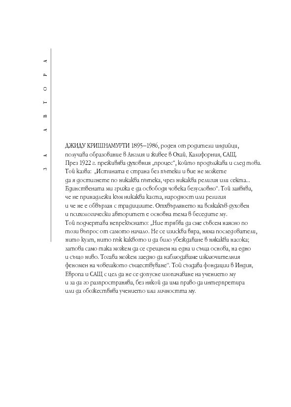 Освен откъси от световноизвестните книги на Джиду Кришнамурти, издадени на многобройни езици в различни страни, този сборник съдържа и извадки от непубликувани разговори и беседи, привличали винаги многобройна възторжена публика.