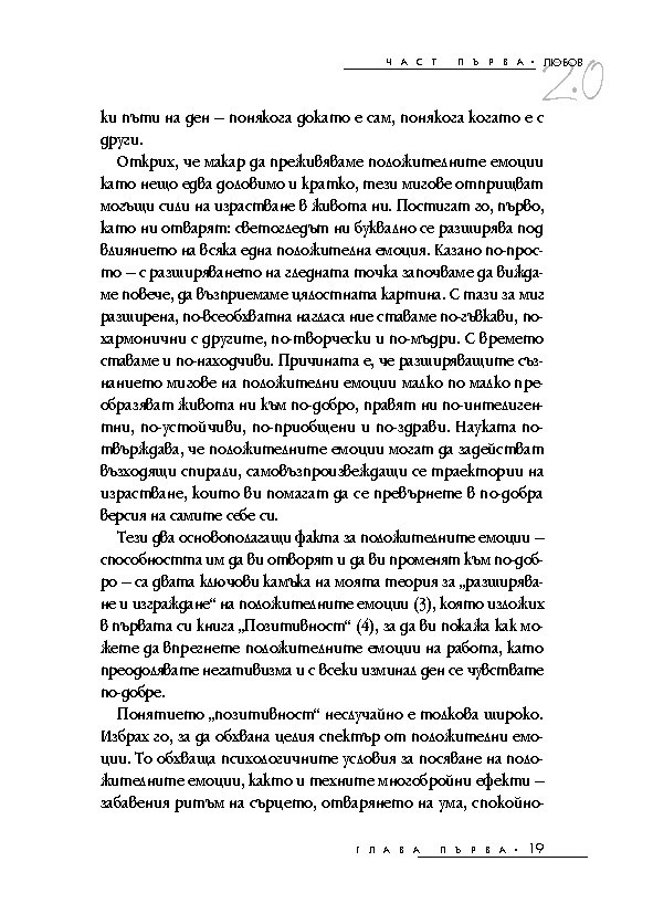 Стъпвайки върху изследванията на собствената си лаборатория, Фредриксън предефинира любовта от представата за як и несломим мастодонт в микромоменти на свързване между индивидите, било то и непознати. Показва ни, че нашата способност да изпитваме любов може да бъде измерена и усилена, така че да ни донесе по-добро здраве и дълголетие. И накрая, авторката ни запознава с формални и неформални практики, благодарение на които да отключим любовта в собствения ни живот, да станем по-състрадателни и дори да утешим себе си.