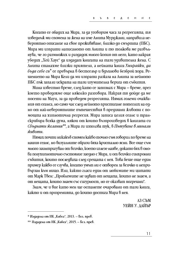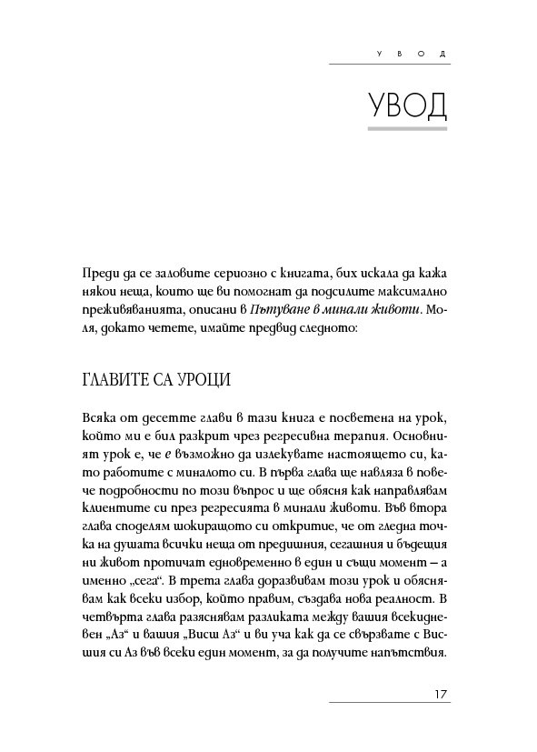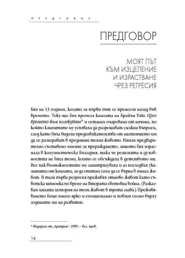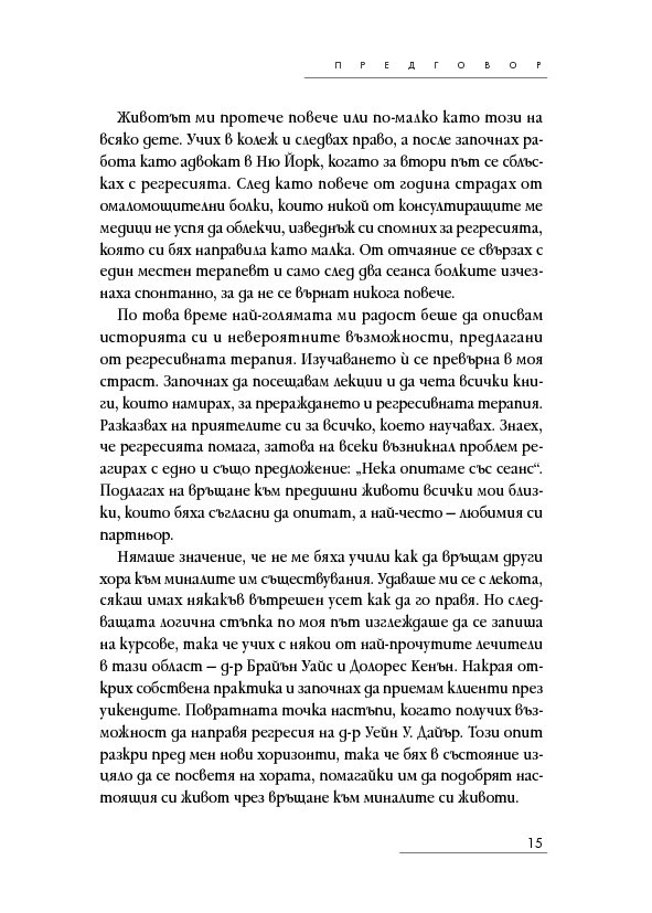 Историите на тези страници ще ви помогнат да откриете как да лекувате тялото, ума и духа си, когато научите повече за естеството на времето, за кармата, съдбата и свободната воля – както и как всеки избор създава за вас нова реалност. Ще разберете как регресията е помогнала на други хора да се пренесат в реалност на здраве и благополучие и ще бъдете насочени как да постигнете същото и за себе си.