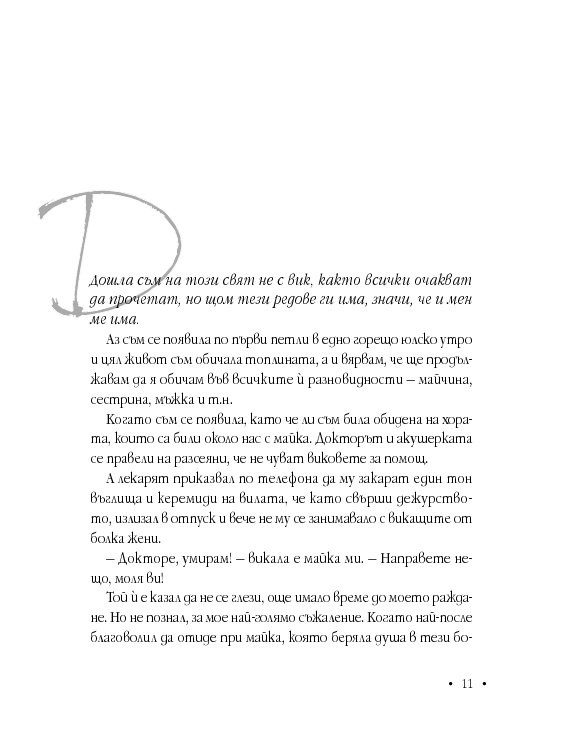Разказът е мозайка от епизоди, наблюдения, възприятия и обобщения, оставили отпечатък у човек, който по обективни причини гледа на света и хората от друг ъгъл. Като се почне от детското „Не можех да разбера защо…“ (не ме водят …, не ме канят на…, с какво ги бях обидила…) през претръпналия коментар за лекарската грешка на калпавия доктор по време на раждането й. И напук на всичко днес тя участва в театрални постановки, наваксва с ученето, написала е (засега една) книга и много стихотворения. Всекидневно преодоляване на проблеми, немислими за нас, хората, които имаме много повече от ляв палец.
