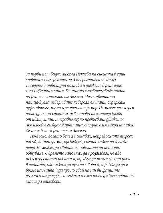 За първи път видях Анжела Пенчева на сцената в един спектакъл на групата за Алтернативен театър. Тя седеше в инвалидна количка и държеше в ръце една многоцветна птица. Птицата следваше движенията на ръцете и тялото на Анжела. Многоцветната птица-кукла извършваше невероятен танц, съдържащ ауфтактове, паузи и устремен тремор. Не можех да гледам нищо [...]