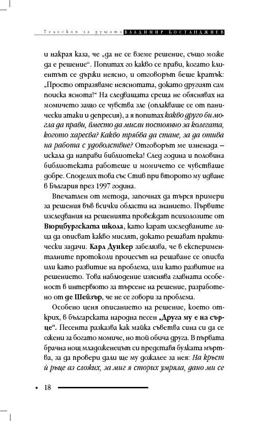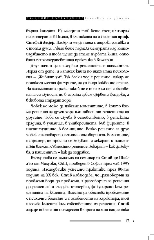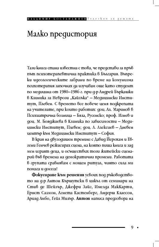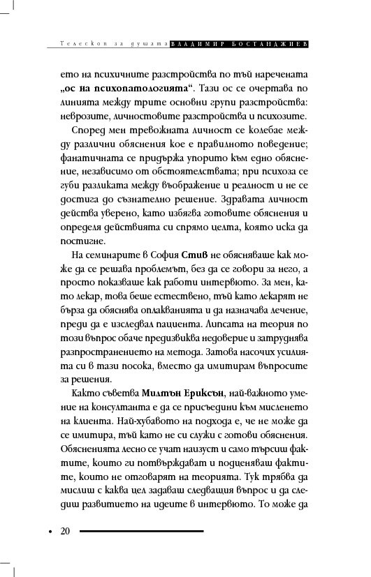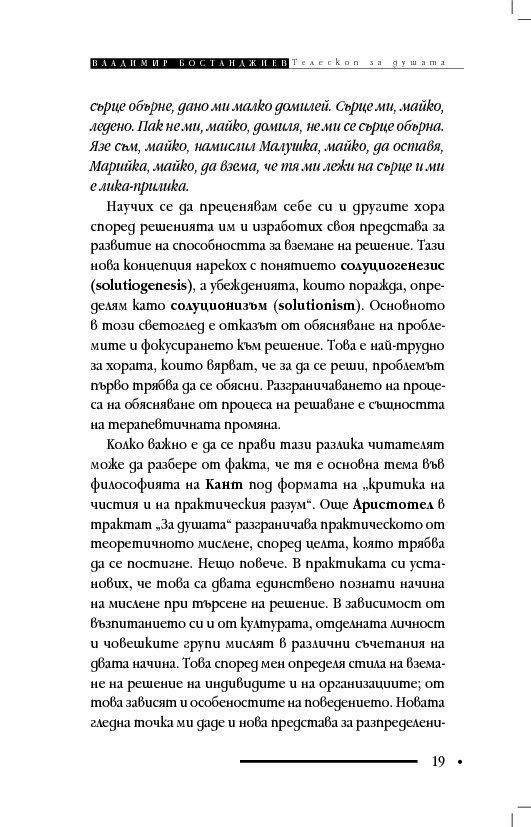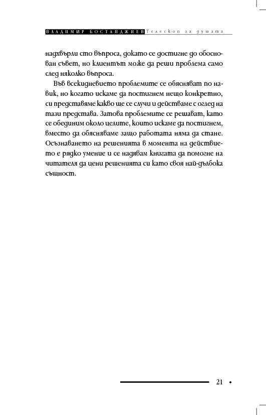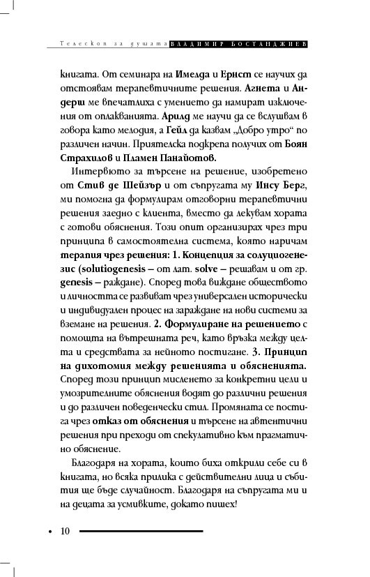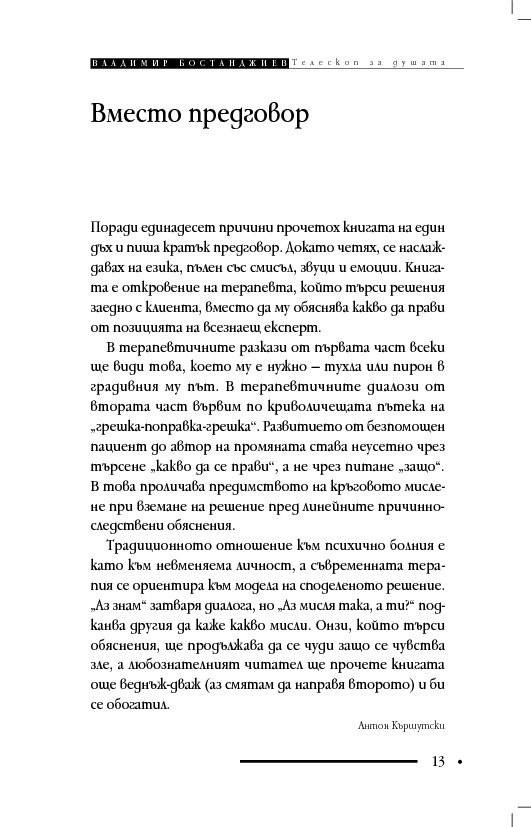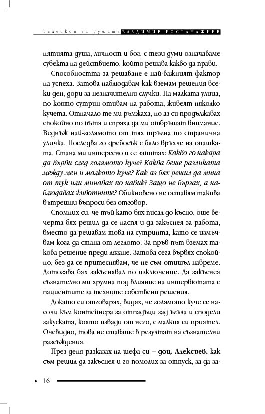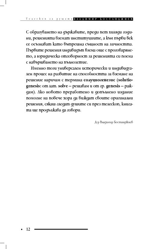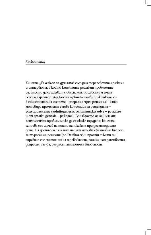 Книгата „Телескоп за душата“ съдържа терапевтични разкази и интервюта, в които клиентите решават проблемите си, вместо да се лекуват с обяснения, че са болни и имат особен характер. Д-р Бостанджиев описва практиката си в самостоятелна система – терапия чрез решения – като мотивира промяната с нова концепция за решенията – солуциогенезис (solutiogenesis: от латински solve – решавам и от гръцки genesis – раждане). Решаването на най-малкия психологичен проблем може да се окаже трудно и книгата започва със случай на нощно напикаване при десетгодишно дете. На достъпен език читателят научава ефективни въпроси за търсене на решения (по De Shazer) и прости съвети за справяне със състояния на тревожност, паника, натрапливости, депресия, загуба, раздяла, патологична влюбеност.