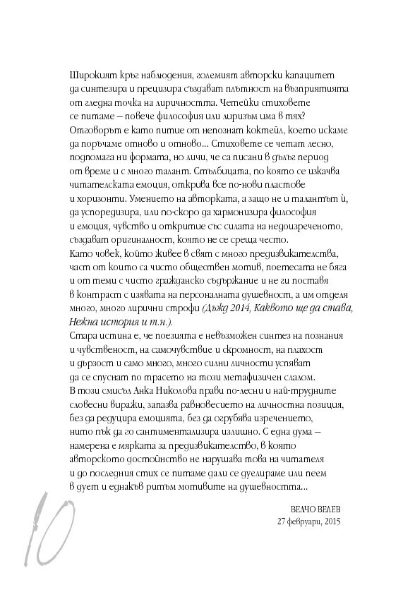 Стиховете на Анка Николова трансформират стандартната ни представа за поезия. Лиризмът им, преминал през ситата на интелектуализма, отсява каквато и да е фалшива нотка на сълзливост и приповдигната сантименталност, които понякога се приемат за визитна картичка на поезията.