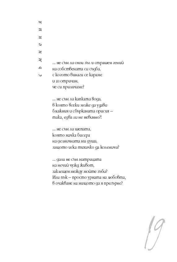 В „базата данни“ няма развихреност на чувствата, но има посята буря, предизвикателство към интелекта, широта на кройката и много други параметри, на пръв поглед извън поетичната настройка на човешката душа.
