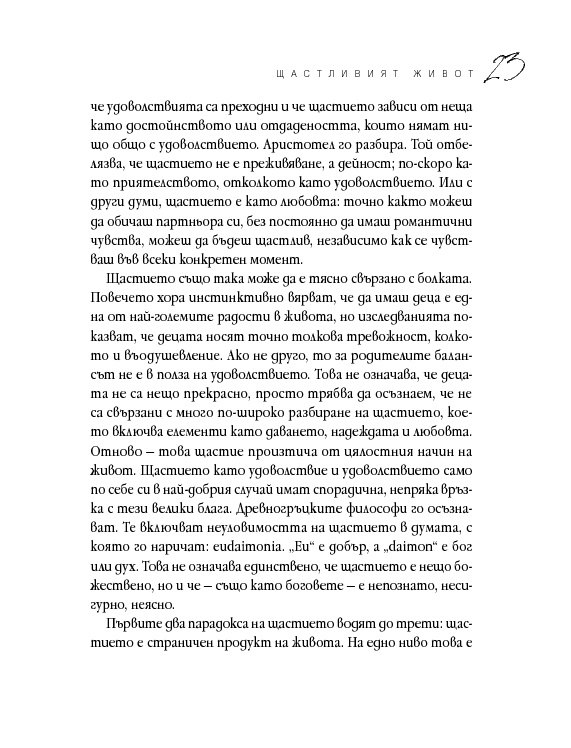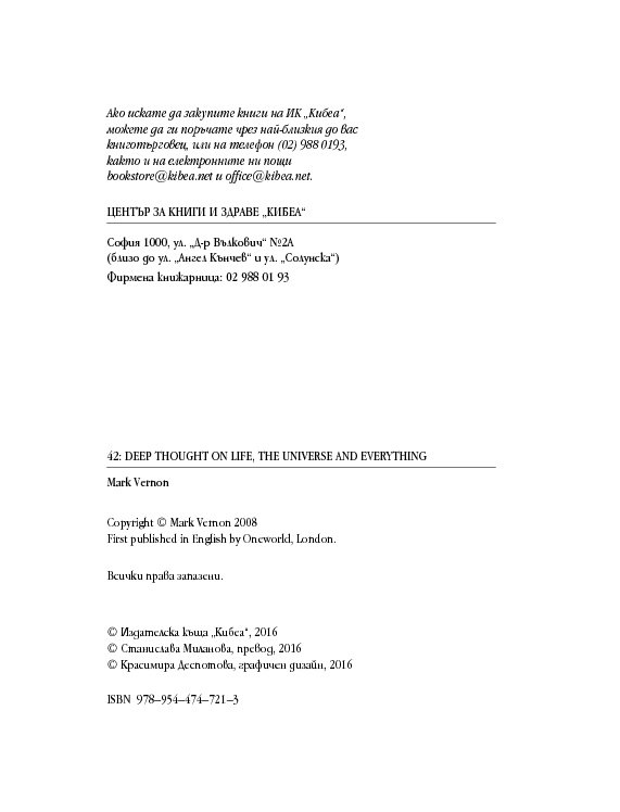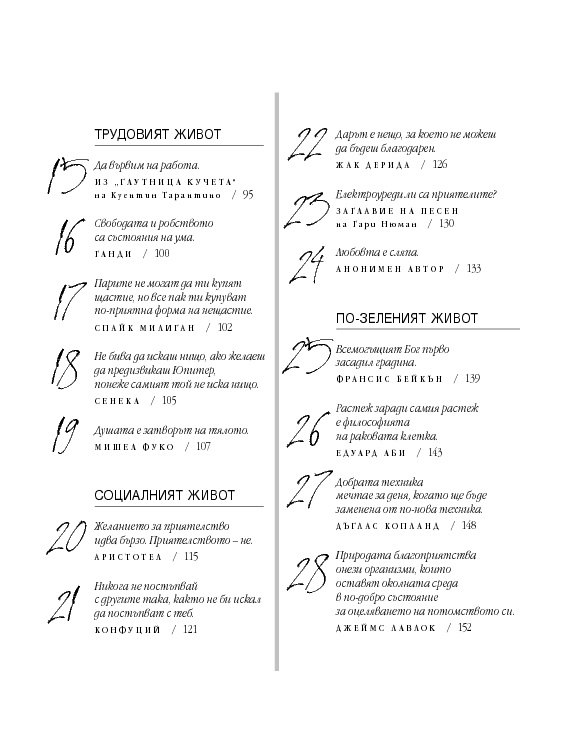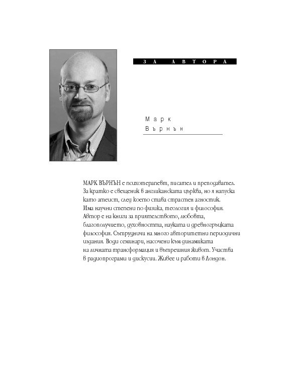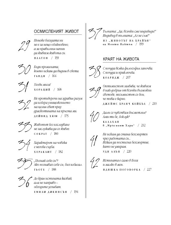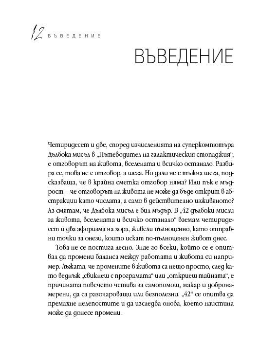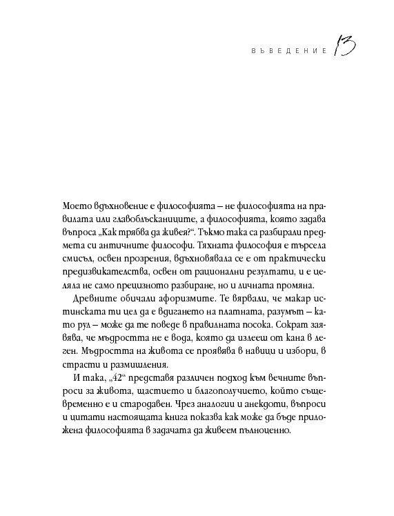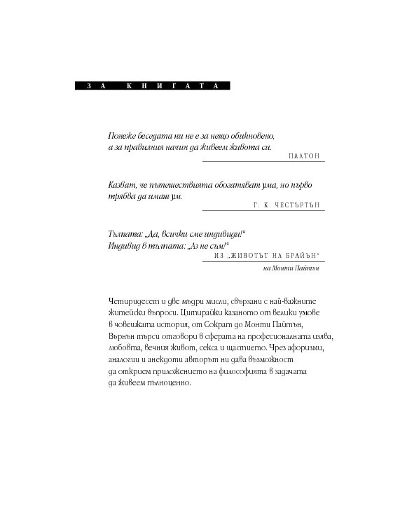 Четиридесет и две мъдри мисли, свързани с най-важните житейски въпроси. Цитирайки казаното от велики умове в човешката история, от Сократ до Монти Пайтън, Върнън търси отговори в сферата на професионалната изява, любовта, вечния живот, секса и щастието. Чрез афоризми, аналогии и анекдоти авторът ни дава възможност да открием приложението на философията в задачата да живеем пълноценно.