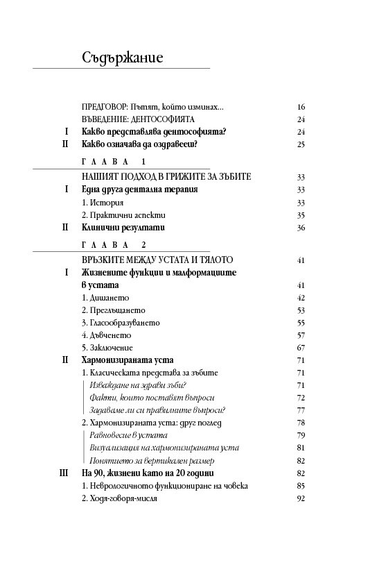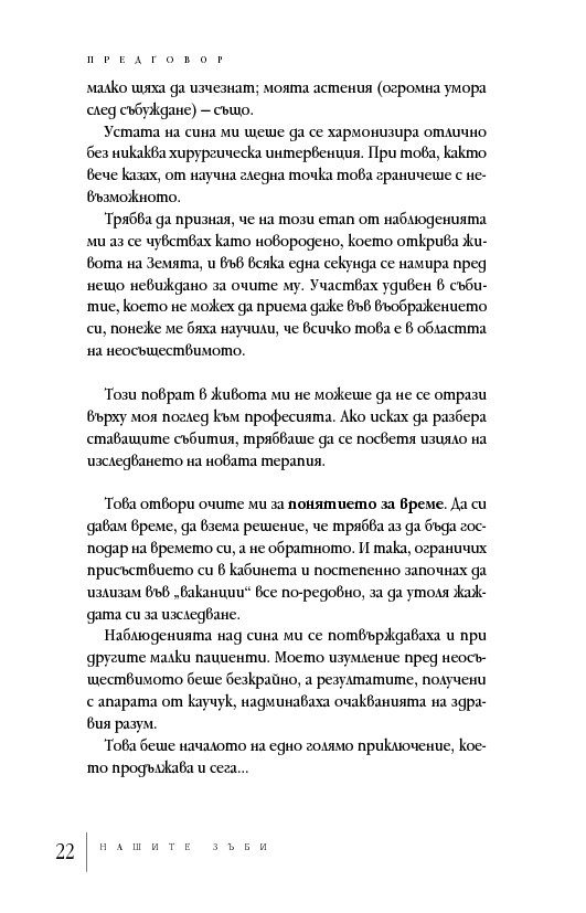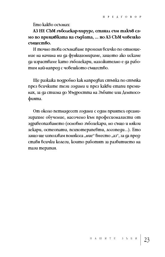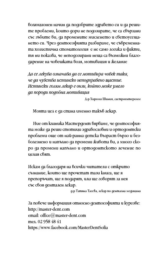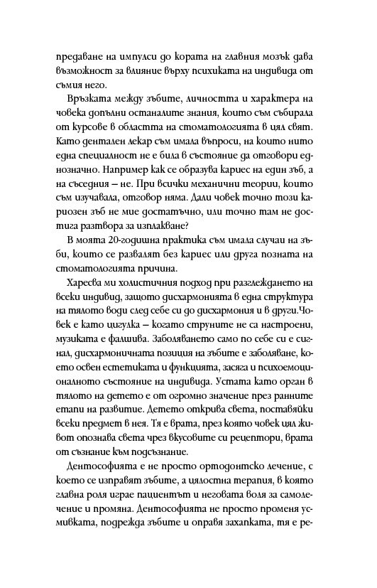 На тези страници читателят ще се срещне с едно не много известно понятие – дентософията (мъдростта на зъбите), което ще го заинтригува с впечатляващи клинични резултати. Тази терапия, която може да се прилага успешно на всяка възраст, не само отстранява деформации в устната кухина, но и подобрява общото физическо и психическо състояние на пациента. Според Мишел Монто дентософията може да се асоциира с китайската поговорка: