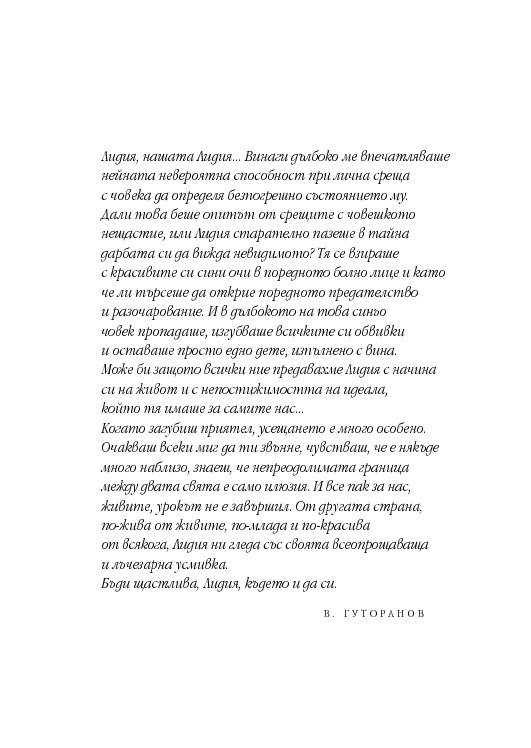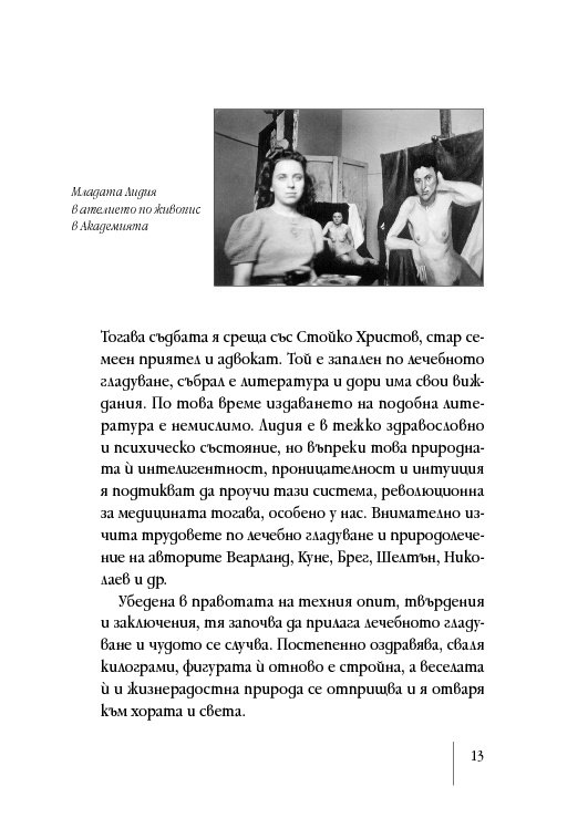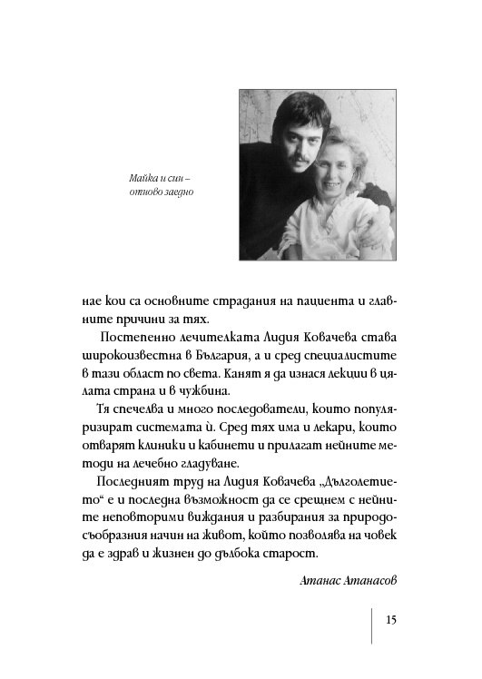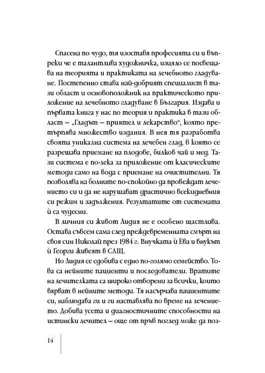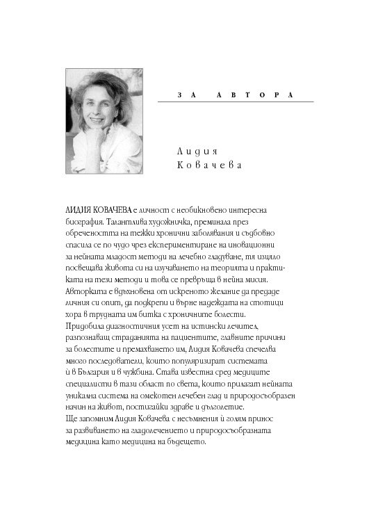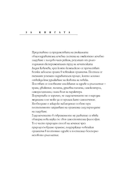 В книгата са представени предимствата на уникалната общооздравителна лечебна система на омекотено лечебно гладуване с плодово-чаен режим, резултат от дългогодишния експериментален труд на лечителката Лидия Ковачева, чрез която комплексно се пречистват всички заболели органи в човешкия организъм. Постига се техният успешен оздравителен процес, което логично отвежда към удължаване на живота на човека.
