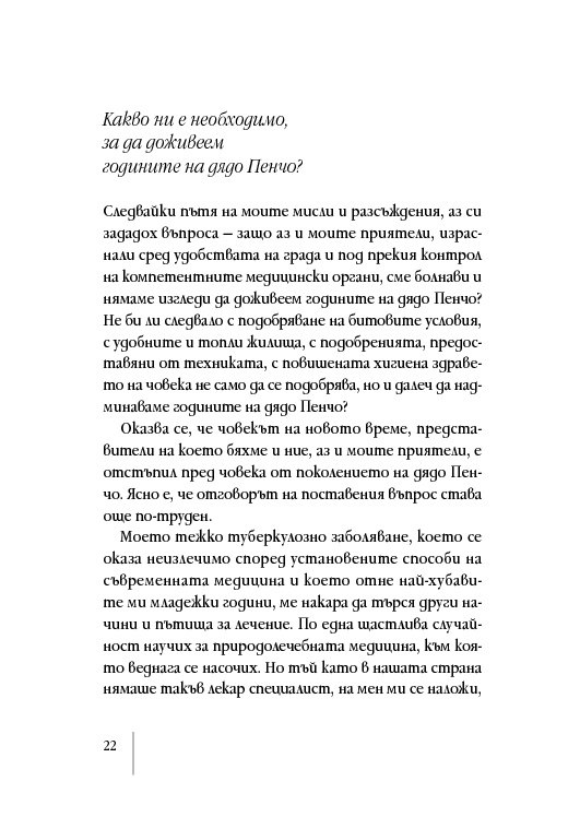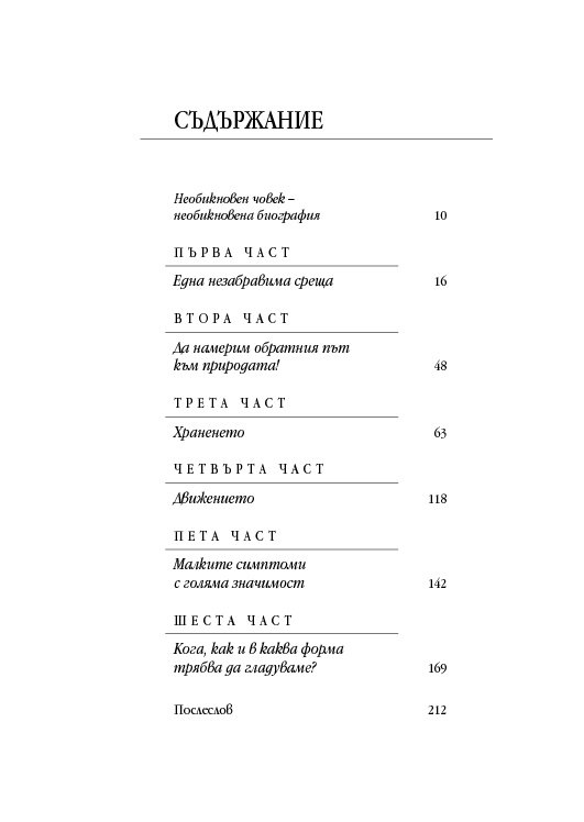 Изцелението на човека – и като вид, и като индивид – се случва по пътя ни назад, към природата. Трябва да се преборим със заблудите, предразсъдъците, невежеството, мързела и нехайството, вкоренени в нас, чрез самоконтрол и постоянство. Има ли целеустременост, всичко се преодолява. Нашият начин на живот трябва да бъде според законите и изискванията на природата.