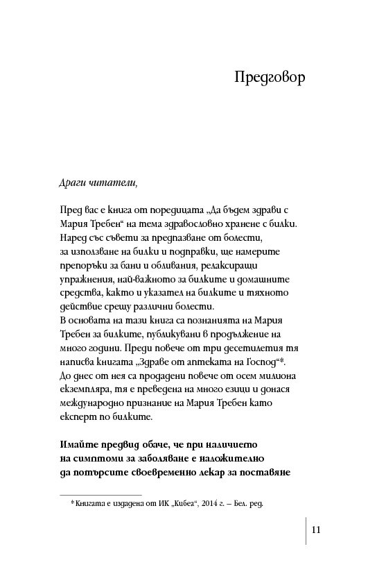 След като издаде (2014 г.) основния труд на Мария Требен „Здраве от аптеката на Господ“, сега ИК „Кибеа“ предлага книга от поредицата „Здрави с Мария Требен“ на тема здравословното хранене с билки. Освен указател на основните билки и тяхното действие тук ще намерите съвети за предпазване от болести, препоръки за релаксиращи упражнения и водолечение. Безспорен интерес представляват и рецептите от кухнята на Мария Требен.