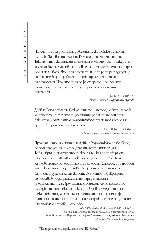 „Дейвид Роум е овладял Фокусирането – метод, който използва мъдростта на тялото за достигане до важните решения в живота. Твоето тяло знае отговора прави това безценно средство достъпно за всички нас.“