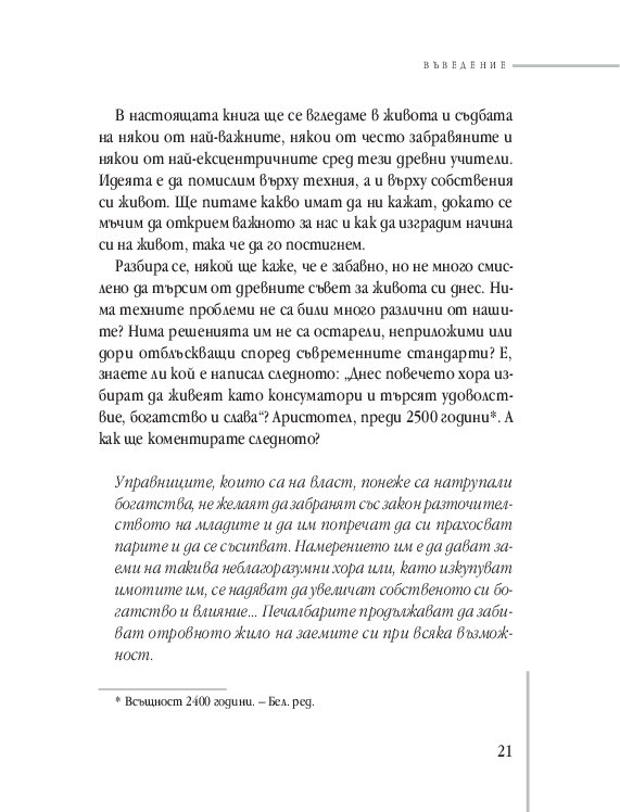 Да се обърнеш към мъдростта на класическата древност е истинско удоволствие. Ползата за ума е двойна – ровиш се в историята и разсъждаваш за настоящето. Защото по един прекрасен начин биваш убеден (и успокоен), че едни и същи проблеми са занимавали хората и тогава, и сега.