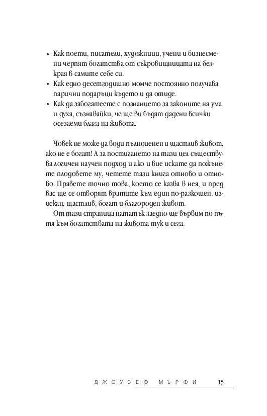 Независимо дали се борите да свържете двата края, или се опитвате да умножите състоянието си, утвърденият подход на д-р Джоузеф Мърфи ще ви покаже колко лесно е да упражнявате пълен контрол над финансовия си успех. Той ви разкрива поредица от прости, ежедневни стъпки, чрез които ще научите: