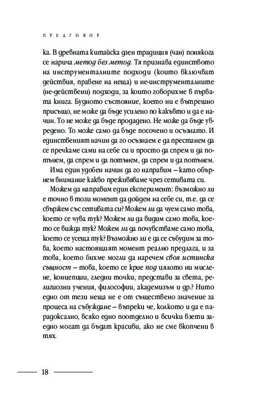 Подробните насоки и инструкции за практикуване на различни техники за медитация: в легнало, седнало и ходещо положение, както и способи от хатха йога, отварят вратите за осъзнаването на момента извън времето и препускащия делник – тук и сега. Ще научите кои са често срещаните препятствия пред практиката за осъзнатост и как да ги преодолявате