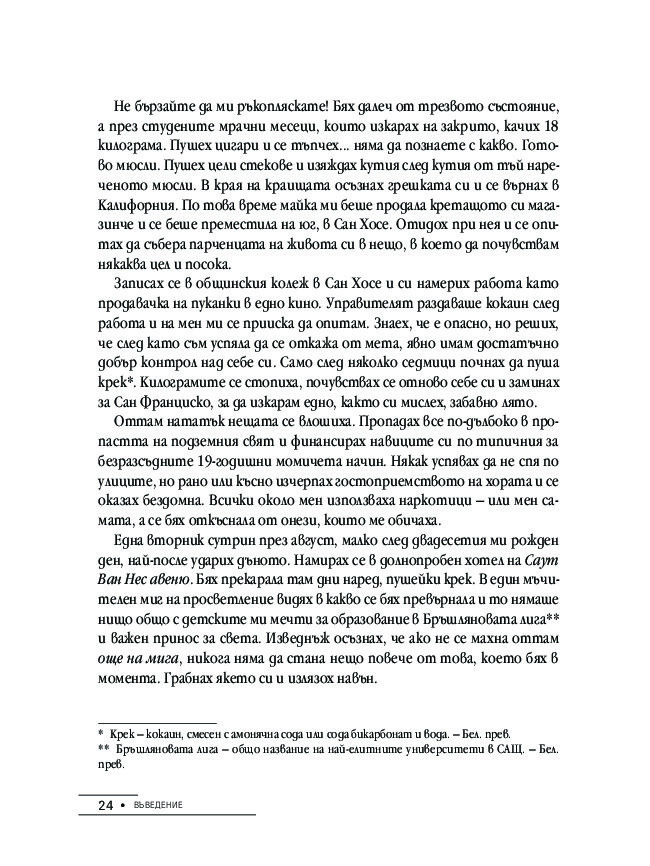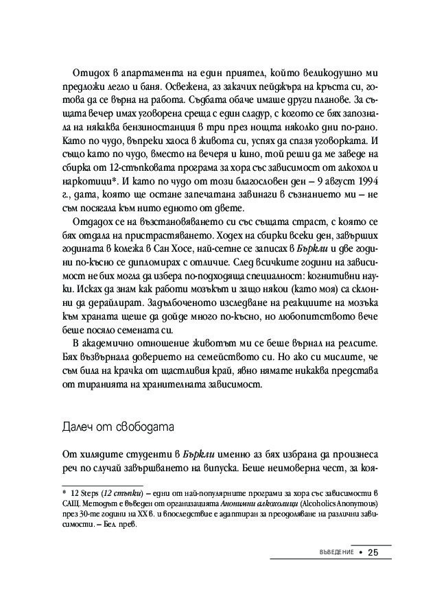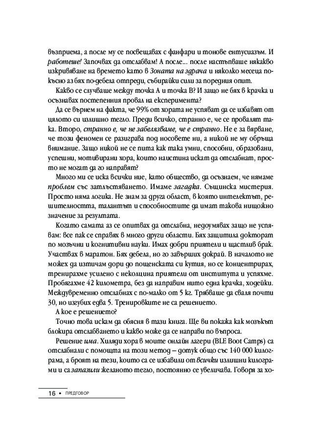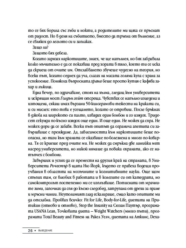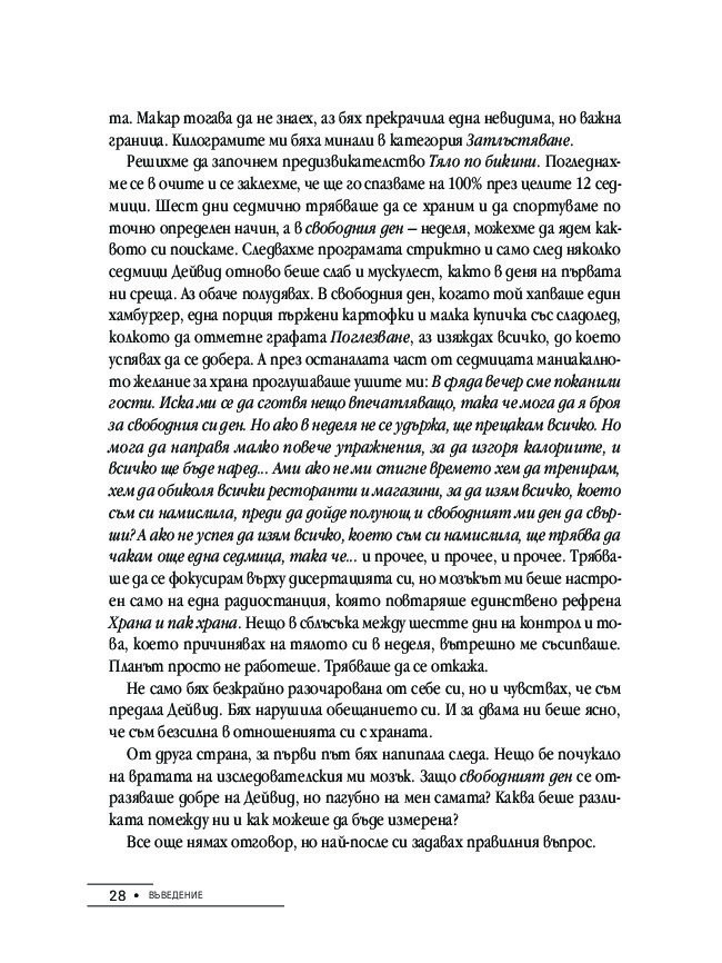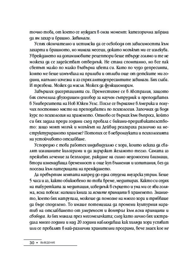 Системата на ясните принципи (Bright Line Eating) е прост подход, целящ да преобърне този процес. Чрез поставянето на ясни и недвусмислени, ненарушими граници Сюзан Пиърс Томпсън ни показва как можем да изцелим мозъка си и да го вкараме в режим, в който да бъде готов да се освободи от ненужните килограми, да се избави от лакомията и да спре да саботира целите ни в отслабването.