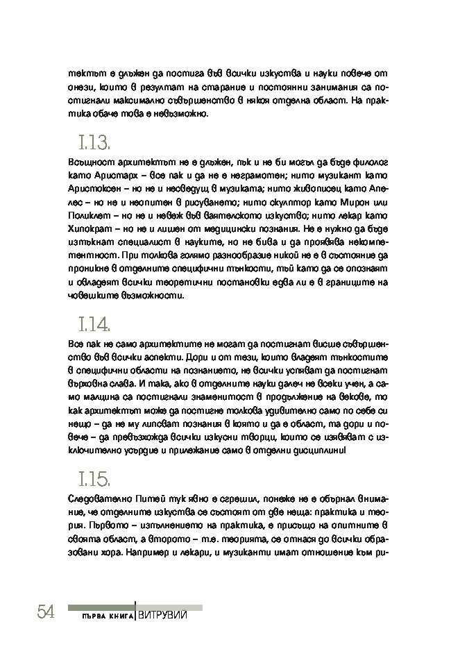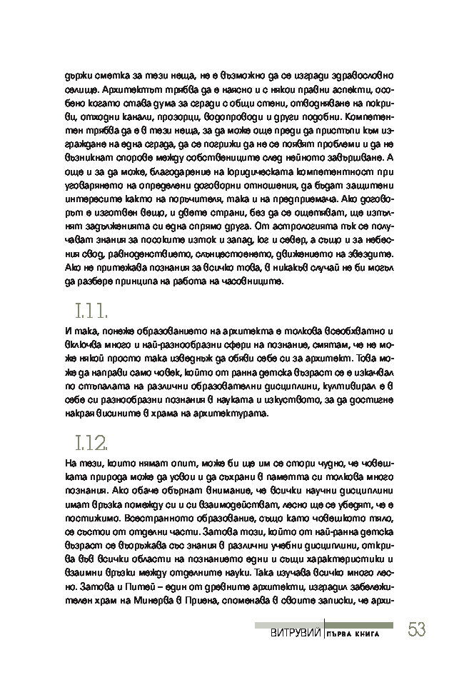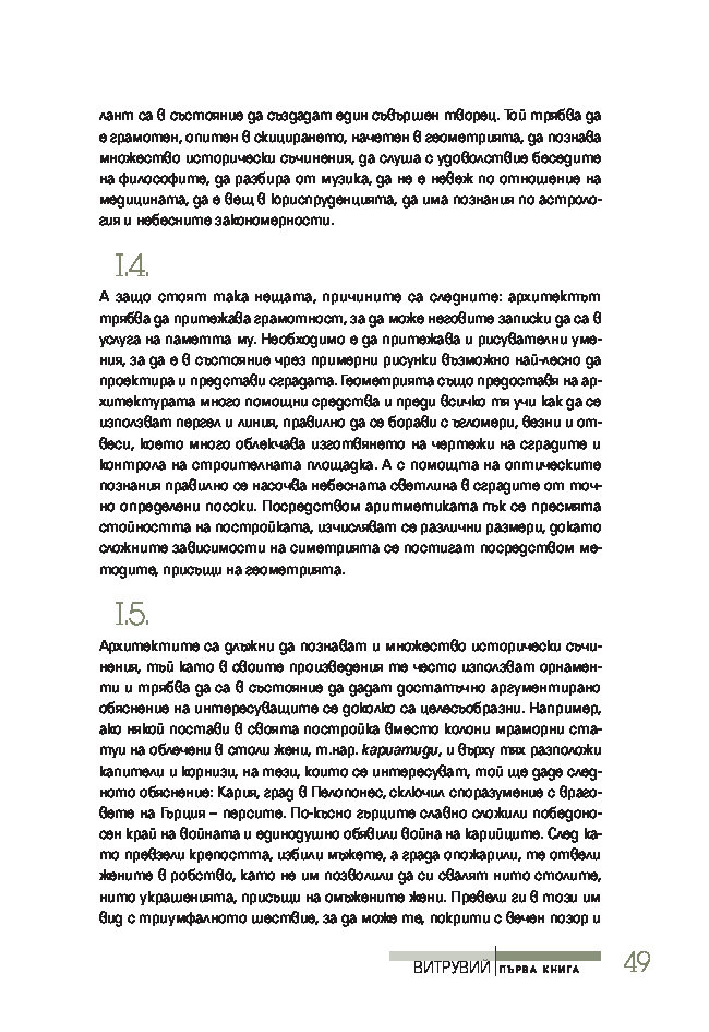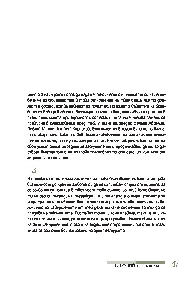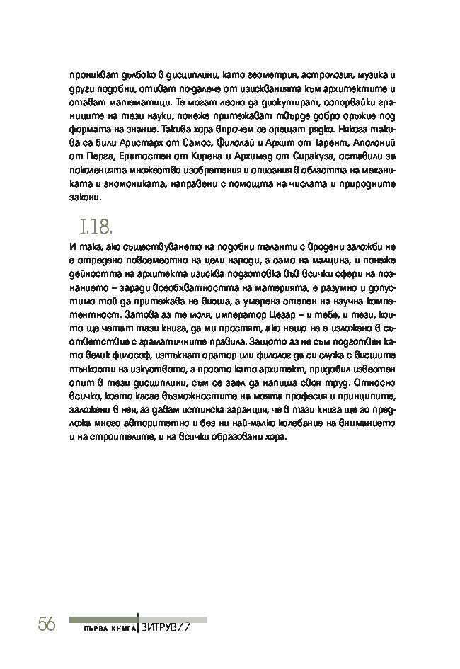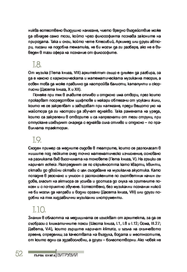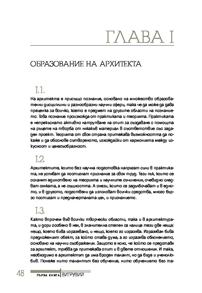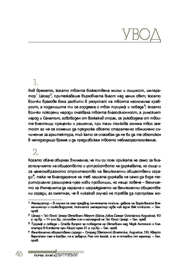 Трактатът се издава за първи път на български език, при това преведен директно от латински – най-ранния от запазените текстове на книгата. Той ще спомогне да се формира представата за античната архитектурна култура на тези, които едва сега се срещат с Витрувий, или да се освежи погледът на онези, които го познават от изданията на почти всички европейски езици.