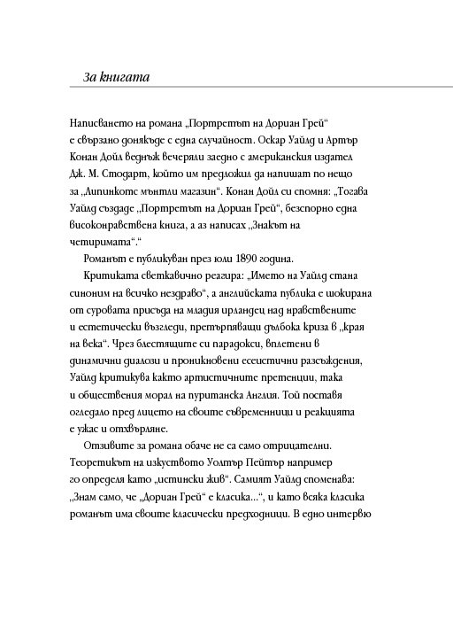 Макар в своя роман, замислен като апология на хедонизма, Оскар Уайлд да заема позата на естет и културен историк, той преди всичко си остава голям майстор на разказа. И ето че повече от век новите поколения читатели продължават да се вълнуват от вечната дилема, поставена от Уайлд в този роман: „Каква полза има човек да спечели целия свят, ако погуби душата си?“