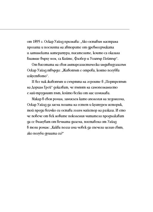 И все пак животът и смъртта на героите в „Портретът на Дориан Грей“ доказват, че пътят на самопознанието е най-трудният път, който всеки от нас изминава.