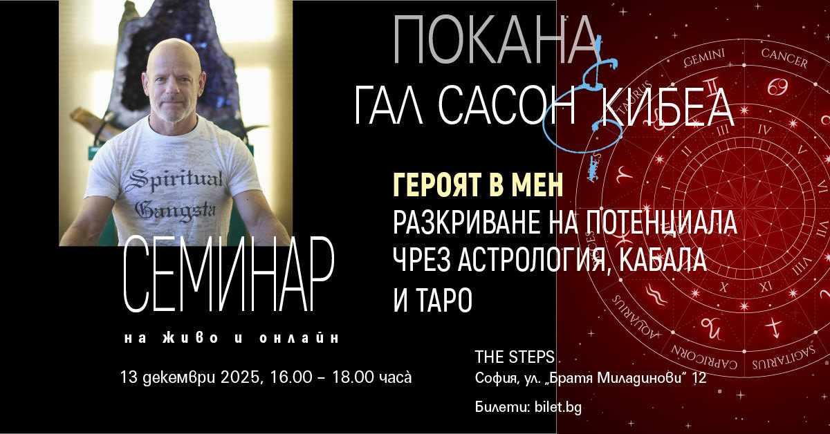 Още от Гал и КИБЕА: На 3 декември ви каним на двоен празник: астрологичен обзор на 2026 и първа среща с книгата „Астрологична прогноза 2026. Метаморфоза в действие“– 10-ото юбилейно издание на български език от поредицата с ежегодни предвиждания на Гал за следващата година. Участниците в лекцията и двата семинара могат да я вземат с –40%.