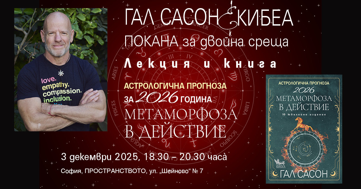 От 18.30 часá Гал Сасон ще представи традиционната си обзорна лекция за следващата година, съчетавайки умело мъдростта на звездите, кабала, нумерология, история и митология. Специално за първата му предколедна среща с кибейските ПОчитатели ще излезе от печат и книгата „АСТРОЛОГИЯ 2026. Метаморфоза в действие“. 10-ото юбилейно издание от поредицата с годишни прогнози ще се предлага с –40% за участниците в трите събития на КИБЕА с Гал.