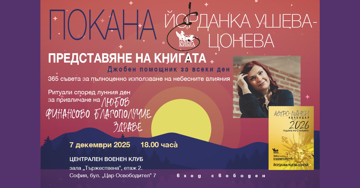 На 7 декември от 18 часá е представянето на „Астро-лунен календар 2026“. С годините удобното и лесно за използване джобно издание се утвърди като предпочитан помощник за пълноценно прагматично оползотворяване на небесните влияния. 365-те съвета за всеки ден помагат да планираме важните събития догодина, а ритуалите според лунния ден – да привлечем любовта, финансовото благополучие и здравето.