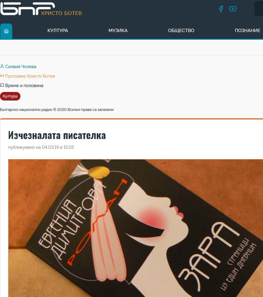 Проф. Милена Кирова, на която дължим новото появяване на Евгения Димитрова (1875-1930), я нарича „изчезналата писателка“. Авторката на два романа и два сборника с разкази от началото на 20 век Евгения Димитрова изчезва буквално от литературната ни история по неизвестни причини. Сега излезе един от романите ѝ– „Зара. Страници из един дневник“, но както четем в предговора на проф. Кирова към него: „за последен път името й се появява в публичното пространство през ноември 1931 г., когато Клубът на българските писателки урежда паметна вечер за две от своите починали членки – Евгения Димитрова и Рена Попова“. Макар за книгите на Димитрова навремето да са излизали рецензии, сред които и от Кирил Христов, съдбата на нейното творчество е да потъне в забрава. Проф. Милена Кирова пише в послеслова към романа, където го анализира: „Най-общо казано, Зара е портрет на женската психика в един исторически кръстопътен момент: вече разбудена и все още потисната, интелигентна и ограничена в старите предразсъдъци, свободолюбива, обаче по онзи егоистичен начин, който европейската интелигенция придобива с философския модернизъм от 19 век.“